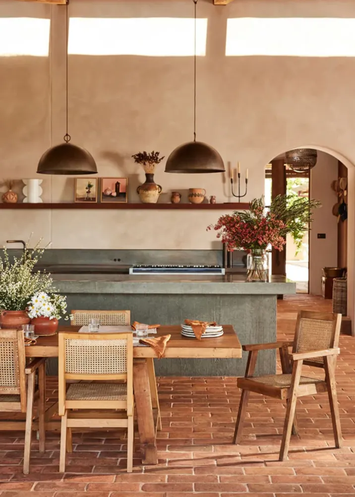 This open-plan kitchen and dining area is an entertainer's dream with its monolithic island bench. The space boasts a decidedly Spanish aesthetic thanks to stucco walls, warm tones, and tiled flooring.