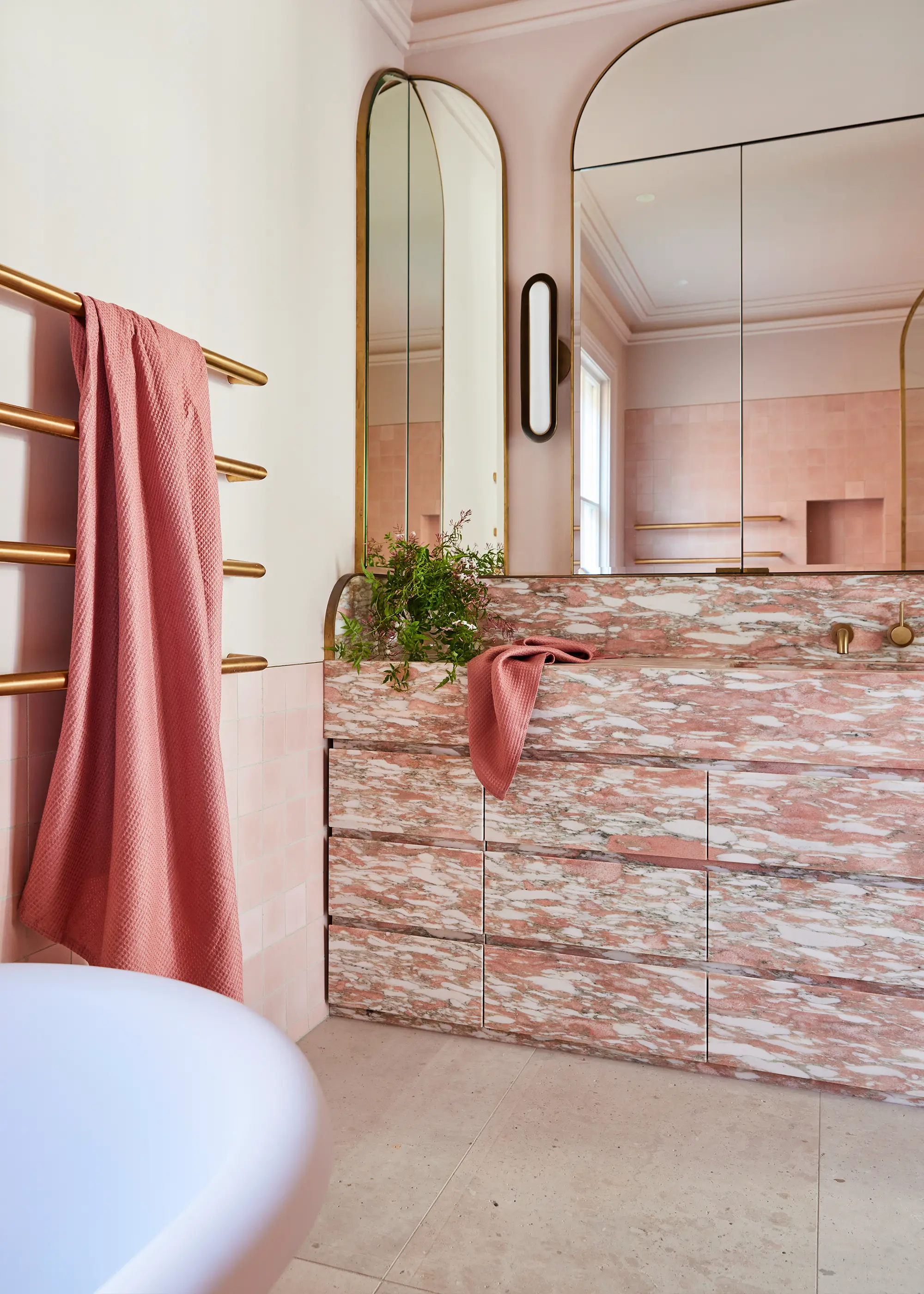 Visitors get their first sense of the home’s interior treasures when they first make their way past the jasmine-laden driveway and note the pale lilac coloring of the exterior, as well as a gently curved structure above the doorway. Inside, the rounded shapes and subtly feminine colorways continue. Oversized mirrors in sherbet colors rest against the walls. Bubble-shaped light fittings add pops of juicy joy. Soft shades of pink and lilac, from the rose marble in the kitchen to the tiles in the bathrooms, give every room a feeling of playful sophistication. The pink bathrooms are in fact some of Dr Naomi’s favorite spaces. “Maybe I love them because I’ve lived with so many horrible bathrooms over the years with all my renovating,” she muses. “Their functionality is perfection.”