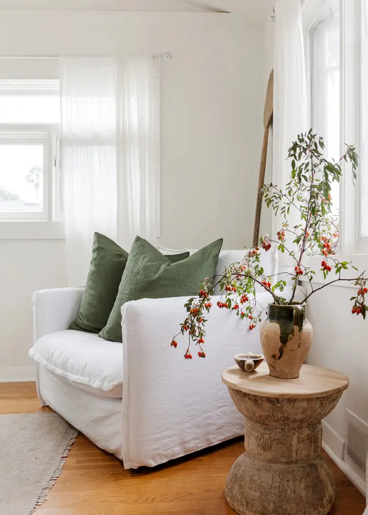 Sage cushions, oatmeal throw, turmeric table linens, leafy greenery in all our vases. I’m even guilty of using seasonal fruit and veg as decor — artichokes, lemons, limes, pears and figs right now. Their bumps and bruises add as much texture and charisma to the space as anything else.