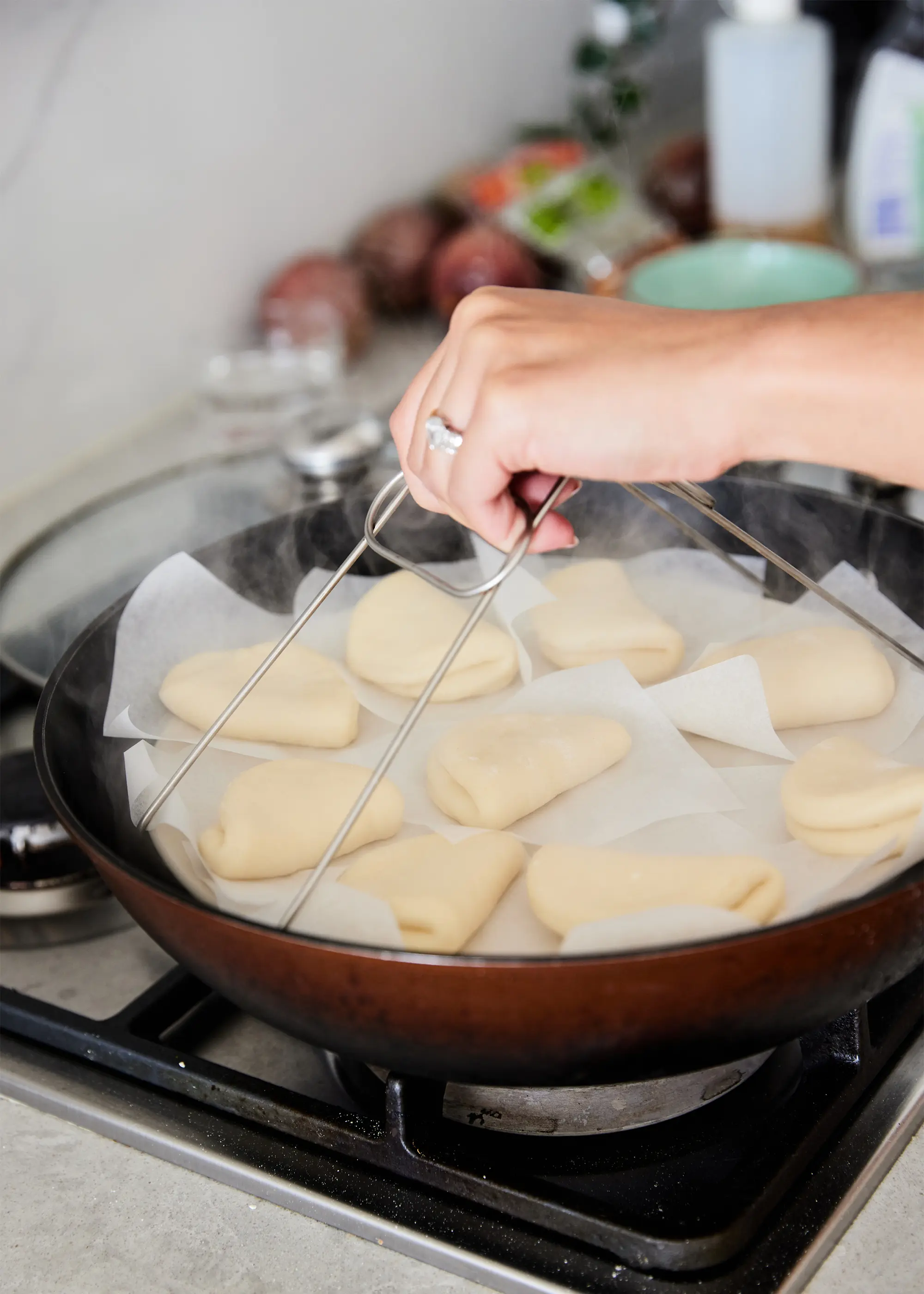 To steam the buns, we are using a wok filled with water and a steam rack. You can also use a bamboo steamer here too. Steam the buns for 12 minutes.