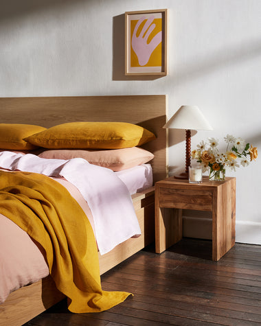 Bring golden warmth to your bedroom with Bed Threads Turmeric Bedding. Soft 100% French flax linen duvets, sheets, and pillowcases designed for year-round comfort and style.